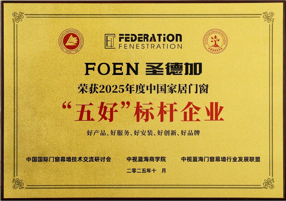 System oceny przedsiębiorstw „Pięciu Doskonałości” (Benchmark Enterprise Selection) to wysoce wiarygodny system oceny w chińskiej branży drzwi i okien. Przeprowadza on kompleksową ocenę przedsiębiorstw w pięciu wymiarach: „doskonałe produkty, doskonałe usługi, doskonały montaż, doskonała innowacyjność i doskonała marka”. Uznanie firmy FOEN Shengdejia za przedsiębiorstwo „Pięciu Doskonałości” (Benchmark Enterprise) odzwierciedla pełne uznanie ekspertów branżowych i konsumentów dla naszych produktów i usług.